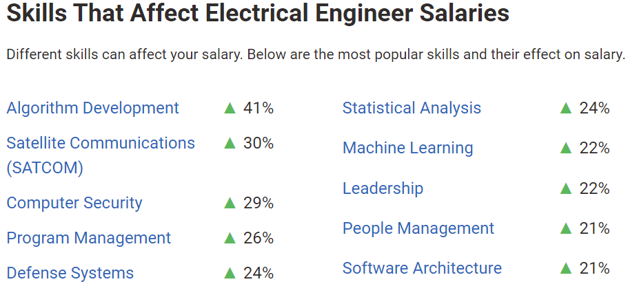 با توجه به گزارش های حقوق در سایت https://www.payscale.com ، مهارت های مختلفی بر میزان دریافتی حقوق مهندسین برق تاثیر می گذارند. همانطور که در جدول زیر مشاهده می شود مهارت هایی مانند توسعه الگوریتم، تحلیل آماری، یادگیری ماشین و معماری نرم افزار می توانند تاثیر قابل توجهی بر میزان درآمد مهندسین برق داشته باشند. مهندسین برق با فراگیری زبان برنامه نویسی پایتون و کتابخانه های تخصصی در حوزه های ذکر شده می توانند درآمد خود را به میزان قابل توجهی ارتقا دهند.