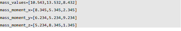 در مرحله بعد، ما متغیرهای لیستی را برای نمایش مقادیر جرم ها و گشتاورهای جرمی اینرسی برای هر جرم نقطه ایجاد می کنیم. اولین مقدار در هر لیست مربوط به جرم نقطه اول، مقدار دوم به دومین و غیره است.
