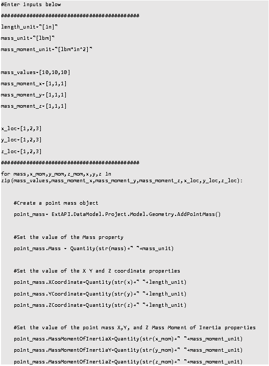 اکنون که دستور ایجاد یک جرم نقطه ای جدید را می دانیم، از یک حلقه for برای تکرار در میان مقادیر لیست های تعریف شده در بالا و ایجاد جرم نقطه استفاده می کنیم. توجه داشته باشید که تابع “zip” به ما امکان می دهد چندین لیست را به طور همزمان حلقه بزنیم. همچنین توجه داشته باشید که مقادیر با استفاده از نوع “Quantity” تخصیص داده می شوند، که اجازه می دهد مقدار بر اساس سیستم واحد انتخاب شده تغییر کند. کد کامل در زیر نشان داده شده است. با توجه به فهرستی از جرم ها، گشتاورهای جرمی اینرسی و مختصات دکارتی، می تواند تعداد زیادی جرم نقطه ای را در عرض چند ثانیه ایجاد کند.