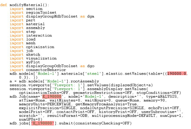 ابتدا با باز کردن فایل در Abaqus PDE (File –> Abaqus PDE) نگاهی به نسخه ایجاد شده قبلی بیندازیم. در Abaqus PDE File –> Open را انتخاب کنید و abaqusMacros.py را باز کنید. بسته به جایی که ماکرو را ذخیره کرده اید.در کد می توانیم نام مدل، نام ماده و خواص مواد را تشخیص دهیم. به همه اینها می توان یک نام داد. با پر کردن مقادیر مختلف برای این پارامترها، ماکرو به طور کلی قابل استفاده است. نسخه اصلاح شده را ذخیره کنید و دوباره بارگیری کنید و آن را از طریق مدیریت ماکرو اجرا کنید تا موارد را امتحان کنید.