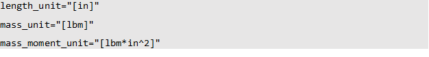 برای ایجاد اسکریپت، ابتدا سه متغیر تعریف میکنیم و مقادیر رشتهای را که واحدهای مورد استفاده برای طول، جرم و گشتاور جرمی اینرسی را نشان میدهند، اختصاص میدهیم.